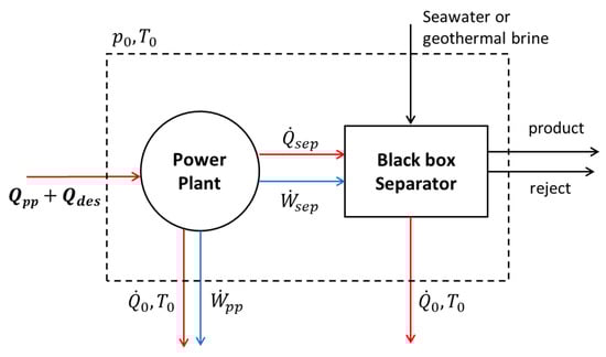 According to the cited literature [,], for integrated processes the “real values” of work/heat depend on the energy production system. Especially if the final aim is the minimization of primary energy consumption, fuel consumption and/or carbon emission, these “real values” should be evaluated in a cogeneration scheme (dual-purpose water/energy plants). Following the approach of Mistry et al. [], the “work value” depends on the global efficiency of the power plant; the “thermal power value” depends on the temperature of the hot source. Here, referring to Figure 2, this methodology is briefly adapted for the geothermal-brine utilization. The overall heat input (primary energy) provided to the system is divided into the power plant amount (Qpp) and the amount necessary to drive the separation process (Qdes). By applying the first and second laws of thermodynamics and by defining the entropy generation in relation to the “intrinsic efficiency of the power plant,” ηpp, it is possible to define the amount of additional energy required for desalination (Equation (4)) and the “modified” second-law efficiency ηII (Equation (5)) in analogy to the work of Mistry et al. []. It should be noted that the thermal powers and the brine are separated for representation clarity, but may coincide since the heat is actually recovered from the wasted brine that, in turn, could be also the feed of the black box separator.