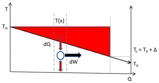 In this case, the “actual exergy input” is lower with respect to the conventional cases where the exergetic input is supplied at a constant or pseudoconstant temperature (e.g. the adiabatic flame temperature for a fossil fuel or the condensation temperature for a steam) and are taken into account though the Carnot efficiency (1 − T0/TH). In the case of sensible heat, the correction factor of Equation (6) can be introduced to account for the lower exergetic input. With reference to Figure 3, considers the exergy variation (decreasing energy availability due to the entropy generation) during the heat transfer from a sensible heat source with respect to the maximum value represented by the Carnot limit.