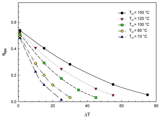 Theoretical values of the correction factor for “sensible heat sources” ηSH in relation to the “hot and cold” temperatures, TH and TC.