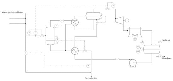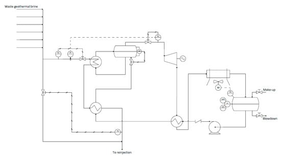 Many authors proposed the exploitation of residual geothermal brines to recover additional energy and/or water and minerals [,,,,,,,]. From the energy recovery point of view, the most concrete answer is offered by the organic Rankine cycles (ORCs), well-established systems capable of achieving acceptable efficiencies at low temperatures [,,].