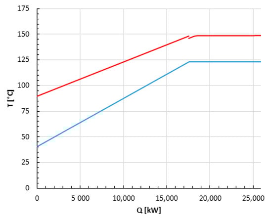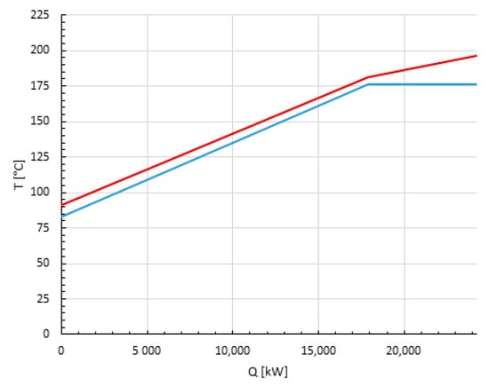 Temperature–enthalpy diagram of the waste heat recovery for the case study 1b, Piancastagnaio.