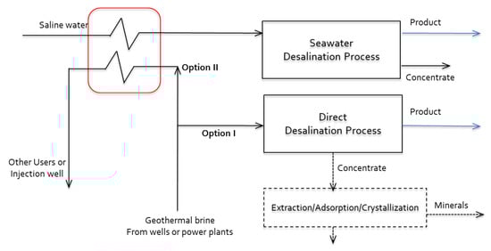 Regarding the water production by desalination technologies, the aforementioned options of brine reuse are depicted in Figure 9. It is possible to use the waste brine as a heating fluid, thereby recovering the heat to preheat a saltwater stream (e.g., seawater) successively sent to the desalination apparatus (Option 2). In some cases the brine itself can be sent to the desalination plant to produce fresh water and a concentrated brine (Option 1). As discussed in the Introduction, the choice depends on the water quality and the end-use; moreover, the second option can also be used to preconcentrate geothermal brines in a perspective of recovering minerals from them.