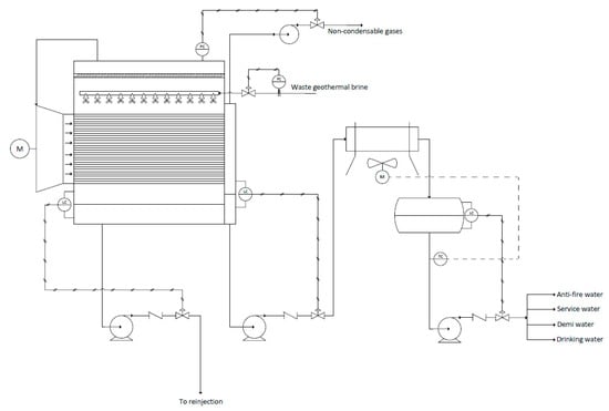 As for water production, an MVC directly supplied by the geothermal brine was analyzed. The basic design was proposed together with a preliminary technical–economic analysis of the desalination plant to produce 10 t/h of freshwater from the reinjected brine. Even if high exergy performance is not attained with this technological choice, a good combination of efficiency and investment costs is achieved. In fact, with the MVC it is possible to produce low-cost water for the uses of the industrial complex. This research group and others in the world are developing technologies (currently at Technological Readiness Level, TRL 4–5) to exploit the huge potential given by wasted hot-saline currents, of which geothermal brines are an example.