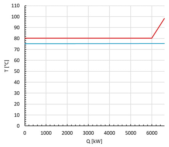 The process is fed with the geothermal brine described in Section 2.2 with a total salts concentration around 5000 ppm (whose characteristics are shown in Table 2). The feed flashes and evaporates at 0.39 bar (75.4 °C). The 74% of the feed is collected at the bottom as concentrated brine (for reinjection) and the 26% that evaporates is compressed to the saturation pressure corresponding to the evaporation temperature plus 5 °C (0.84 bar, 80.4 °C). The enthalpy–temperature diagram of the evaporator is available in Figure 11. The distillate is sent to an air cooler to obtain a final temperature of 40 °C. The described process is controlled by regulating the feed-stream flow rate to keep the degree of vaporization equal to 26%. The heat and material balances of the process were performed in the Aspen Plus environment (thermodynamic model: Electrolyte NRTL) for the capacity of 10 t/h distillate.