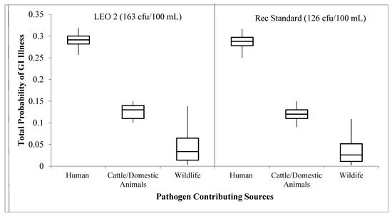 Scenario 3, with the human source only contributing 7% to the FIB concentration, served as the least conservative estimate for the risk to human health; however, the overall estimated risk was similar to Scenario 2. The human source was again found to contribute the greatest to the overall risk followed by cattle, and wildlife/domestic animals for both LEO 2 and the recreational standard (Figure 3). The median risks for a GI illness for each source (as they contribute to the total probability for a GI illness) under each scenario are listed in Figure 2 and Figure 3.