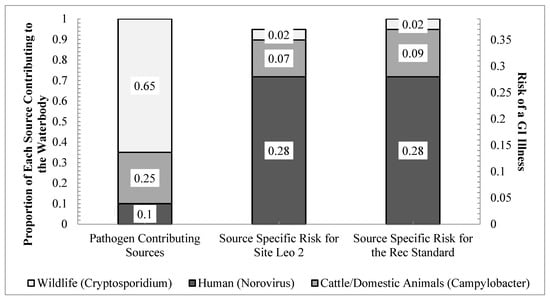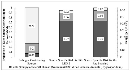 Contribution of each source to the health risk under Scenario 2 (each source contributes according to the microbial source tracking (MST) results). LEO 2 had an E. coli concentration of 163 cfu 100 mL−1 and the recreational standard had an E. coli concentration of 126 cfu 100 mL−1.