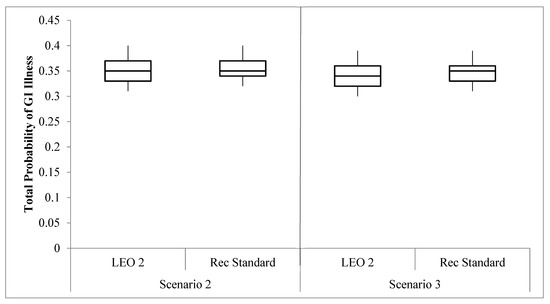 The calculated probabilities for a GI illness under Scenarios 2 and 3. The 5th, 25th, 75th, and 95th percentiles, as well as the median, are presented. LEO 2 had an E. coli concentration of 163 cfu 100 mL−1 and the recreational standard had an E. coli concentration of 126 cfu 100 mL−1.