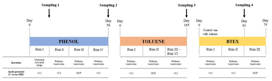 Three different hydrocarbons were used as substrates in the three herein described experiments: Phenol [16], toluene [17], and a mixture of BTEX [18]. Two different inocula were tested: An activated sludge from a municipal wastewater treatment plant and a refinery wastewater. The activated sludge was tested only in the experiment with phenol. Due to the low initial phenol removal performances and the low attained current densities, the reactor was successively re-inoculated with the refinery wastewater [16]. Samples from both inocula (activated sludge and refinery wastewater) and from the anodic graphite granules were collected during the experimental phases of the three separated experiments. A scheme of the experimental plan and sampling is shown in Figure 1. Hereafter, the samples will be named as reported in Table 2.