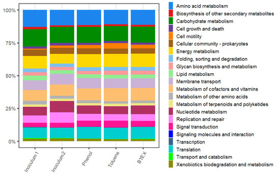 In order to infer how the genomic potential of the anodic microbial communities varied in comparison with the inocula, we analyzed the metagenomic dataset generated from samples inoculum 1, inoculum 2, phenol, toluene, and BTEX. We based it on the functional annotation of the protein Coding DNA Sequence into KO (KEGG Orthology) terms and pathways. The characteristics of the metagenomic dataset are reported in Table S1.