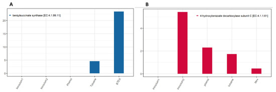 Coverage of (A) benzylsuccinate synthase [EC:4.1.99.11] and (B) 4-hydroxybenzoate decarboxylase [EC:4.1.1.61] based on normalized abundances of CDS classified with KEGG.