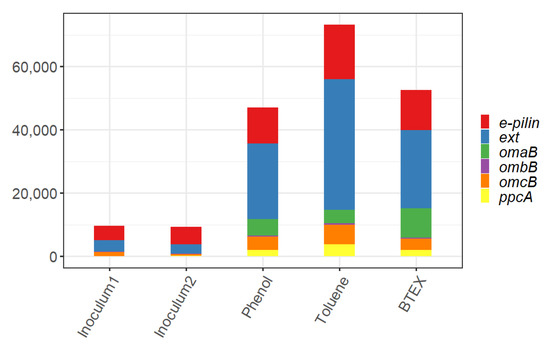 Even though the EET capacity of several bacterial species has been previously described [7], to date, the electrogenic properties of a community have not been described through a whole metagenomic approach. Moreover, the enzymes involved in the direct electron transfer have not been categorized in KEGG orthology or other databases, thus it was not possible to pursue a proper analysis of these specific enzymes in the dataset annotated with KEGG. To overcome this limitation, a custom-made database of aminoacidic sequences of enzymes related to the electron transfer was constructed (see the methods section for details) and compared with our protein query (using the blastp application). As shown in Figure 5, inoculum 1 and inoculum 2 carried the genomic capacity to achieve exoelectrogenic activity, thus a part of the bacterial community was able to transfer electrons to insoluble compounds (as Fe(III) and Mn(IV)). This capacity increased 4-fold for phenol and 7-fold for toluene in the anodic communities, demonstrating that the anode was actually used as a respiratory electron acceptor. Moreover, ext genes accounted for the highest coverage on the anodes (Figure 5). We observed that this group of genes was mainly represented by extA and extG genes (data not shown), which encode for two periplasmic dodecaheme c-type cytochromes of Geobacter sulfurreducens [36] and which are, among the ext operons, crucial for growth with electrodes [51]. Conductive pili genes were the second most abundant EET category found on the anodes. It has been reported that electrically conductive pili (e-pili) can pursuit long-range electron transfer to insoluble electron acceptors, to other cells, and through electrically conductive biofilms [35]. In our study, the highest coverage of pilA sequences belong to the genera Desulfobotulus, Geobacter, and Thauera. Even if e-pili genes were primarily described in the order Desulfuromonadales, it has been recently described that genera, such as Desulfobotulus, Desulfobacterium, Desulfobacula, and Thauera (among others), own e-pili genes [35]. Even if none of these organisms are known to be able to use Fe(III) as an electron acceptor, it has been suggested that one of the primary functions of e-pili may be interspecies electron exchange [35]. We thus hypothesize that in our bioelectrochemical reactors, Geobacter was the main responsible microorganism for direct electron transfer to the anode (through the enzymes coded by ext and pilA genes) and that other species might have also been involved EET through e-pili, directly to the anode or indirectly through other cells or the biofilm.