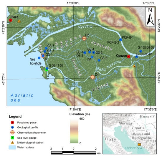 - Elektrosond Zagreb. Hydrogeological investigation works Opuzen-mouth of Neretva; Elektrosond Zagreb: Zagreb, Croatia, 1963. [Google Scholar]