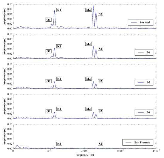 After detrending was done for the raw data series observed at the location of the sea level gauge; barometric pressure gauge; and piezometers D1, D2, and D4, in order to eliminate the effects of long-term trends, the observed time series were transformed to frequency domain by applying FFT, as shown in Figure 5. This enabled an insight into the dominant harmonic constituents of the analyzed variables. Barometric pressure was identified by the presence of semidiurnal S2 and diurnal K1 constituents corresponding to changes of temperature (day–night, heating–cooling) and, consequently, the pressure changed. Besides S2 and K1 constituents, barometric pressure amplitude spectra emphasized the presence of low frequency periodicity.