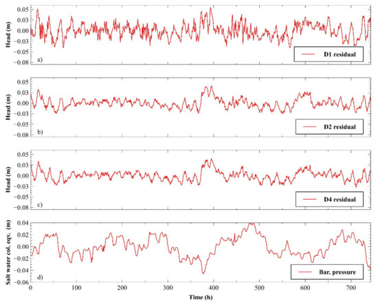 By the use of solely tidal components of the sea level in tidal methods, we performed a validation of obtained parameters when they were applied to the period of 1 July to 31 July 2015. The same hydrogeological parameter values, as determined for the period of August 2015, were used to generate tidally induced piezometric head at piezometers D1, D2, and D4. In the same manner as for August 2015, the observed sea level was analyzed in the frequency domain and the main constituents were identified. After identification of tidal constituents, we generated tidally induced piezometric head by using modified Equation (13) from [26] within the piezometers D1, D2, and D4. The results shown in Figure 9a–c emphasize good matching between the modeled time series and the time series obtained from measured signals by identification of only tidal constituents. The RMSE values determined were as follows: D1 RMSE = 0.005724, D2 RMSE = 0.007939, and D4 RMSE = 0.00458. Although a slight increase in RMSE values can be seen, still good matching was evidenced by visual inspection of Figure 9a–c.