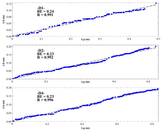 The idea of barometric efficiency determination relies on the Rahi method [41], which is a physically based improvement of Clark’s method [42]. Following the features of signal residuals, the Rahi method was applied to determine the value for each of the monitoring piezometers at the site. The results are shown in Figure 7 and give good insight into the aquifer’s water level response to changes in barometric pressure. Because the usage of vented gauges enables insight into real water table fluctuations caused by both effect of increased loading from the surface or tides, which both cause increase of the aquifer pore water content internal pressure and the changes of barometric pressure, the available datasets can be used to determine BE. The obtained values varied in a minor to negligible way in between the three analyzed piezometers, ranging from 0.24 for D1 piezometer to 0.23 found at D2 and D4 piezometers. The values were determined for the largest significant correlation obtained for variable time lag between the barometric pressure and piezometric head residuals. Time lag for piezometer D1 corresponded to 1 h, the same as for D2, whereas no time lag was observed for D4. Following the definition of loading efficiency and its functional relationship with [7,70], after was known, values were equal to 0.76 (D1) and 0.77 (D2 and D4).