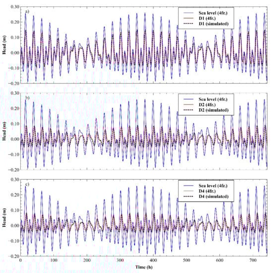The RMSE value obtained for D1 was equal to 0.004579 and corresponded to = 470 m2 s−1, = 1400 m, and = 1 day−1 obtained for x equal to 305 m. The lower hydraulic diffusivity value in comparison to D2 was caused by two factors: (i) smallest hydraulic conductivity of the aquifer layer piezometer penetrates to, and (ii) lower aquifer thickness (only 1.20 m) compared to more than 60 m at D2 [62,63,64]. For the sake of completeness, D4 was represented by the same methodology but with one difference in the conceptual model compared to D1 and D2, relying on the fact that the karstic bedrock located between the sea and the D4 location is identified as significantly fractured and with the presence of high conduits [65] representing a highly permeable border. In this manner, outlet capping was still used with the parameters and , as defined previously. The lowest observed RMSE was equal to 0.004258 and corresponded to = 235 m2 s−1, = 0 m, and = 0 day−1, which implies absolute confinement of the aquifer in this part of the domain and emphasizes the validity of the assumption regarding extended roof non-presence. The value obtained for the lowest RMSE value was equal to 2500 m, which represents the actual distance between D4 and the inner karstic area border southwest of the piezometer location. Good agreements and consequently low RMSE values of tidal induced piezometric head time series are demonstrated in Figure 8a–c.