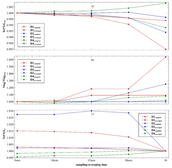Because the study relied on available datasets observed at the same sampling frequency, we performed the inspection of different sampling and averaging time scales. From 30 April to 4 May 2019, a 4 day dataset was performed with 5 min sampling time to conduct the convergence test of the sampling and averaging time analysis and its influence upon major piezometric head signal parameters and . Firstly, sea level was used as observed with a 5 min sampling scale, whereas piezometric head sampling time was variable (5, 10, 15, 30, and 60 min). Secondly, sea level was used as defined on a 60 min sampling scale, whereas piezometric head sampling time was variable (5, 10, 15, 30, and 60 min). Parameters and were defined in a same manner as explained within Section 2.4 and shown in Figure 10a–c. Independently of the sea level signal sampling time, tidal efficiency showed less than 0.4% relative difference, even when 60 min sampling time was used. Apart from , was found to be more sensitive to sampling time. Figure 10b implies a 10 min sampling time to reduce relative difference in below 2%, with hourly sampling time relative error equal to 10% for D1, whereas D2 and D4 showed a satisfactory difference (below 3%). If, instead of sampling time, an averaging time was analyzed, it would be demonstrated that the obtained difference is double the one obtained for the equivalent sampling time.