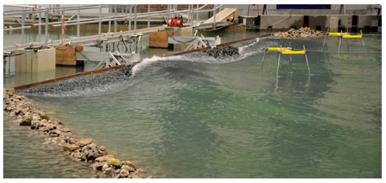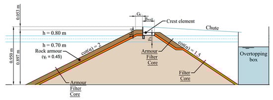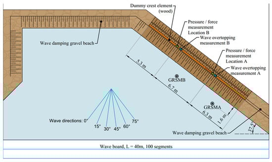 Waves were measured using directional wave gauges (GRSM) at two locations in front of the model so the incident and reflected waves could be separated. The directional wave gauges were located to be in the same line as the measurement cross-sections for a wave angle of 37.5°, which is the average of all the tested angles and perpendicular to the wave paddle (see Figure 1). Small variations observed between both measurement points were accounted for in the following analysis; measurements of GRSM-A were used for Test section A, and measurements of GRSM-B were used for Test section B. In following analysis, incident waves at these locations at the toe were used. The spectral significant wave height (Hs = Hm0 = 4√m0) and the spectral mean wave period (Tm−1,0 = m−1/m0) were obtained from the measured wave energy spectra. Tm−1,0 was first found to better describe the influence of wave energy spectra on wave run-up and overtopping in [,]. Later, Tm−1,0 was applied as the best wave period to describe other interaction processes between waves and coastal structures, see for instance []. Thus, this spectral wave period was also used in this study. The mean overtopping discharge was also measured in [], using two overtopping chutes and boxes (see Figure 5).