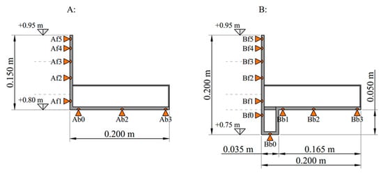 Figure 3 presents the two crest wall configurations used in the tests, made of aluminum, as well as the location of the pressure transducers. The two crest walls configurations are identical except for the key placed at the intersection between the front wall and the bottom of the crest wall. The presence of a key is desirable from the geotechnical perspective, since the passive earth pressure is increased. Crest wall A does not present the key, while Crest wall B does. Pressures were measured at the front side of the crest wall and underneath it for both crest wall configurations using 18 pressure transducers. These transducers have a frequency response of 5 kHz, an accuracy of 0.06% of the full scale (Best Straight Line), and a range of 350 mBar. In Crest wall A, five pressure transducers were located in the front wall, and three pressure transducers were placed in the baseplate. In Crest wall B, two additional pressure transducers were located: one in the front wall and one in the baseplate. No movement of crest walls was ensured by fixing them to steel frames, as shown in Figure 4.