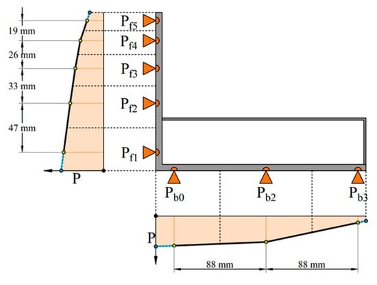 Each pressure transducer provided a point of pressure (kN/m2). The pressure distribution along the front and base of the crest wall was obtained by assembling the points of pressure (see Figure 5). The pressure distribution was extrapolated toward the edges of the crest wall. Pressure transducers were located as close as possible to the edges of the crest wall to minimize extrapolation, and the extrapolated pressures were set to a lower limit of 0. In Figure 6, the extrapolation zone is indicated with blue dashed lines. The pressure distribution was integrated along the front and base of the crown wall to obtain the force on the crest wall. It resulted in a horizontal force on the front of the crest wall (FH) and a vertical force on its base (FV).