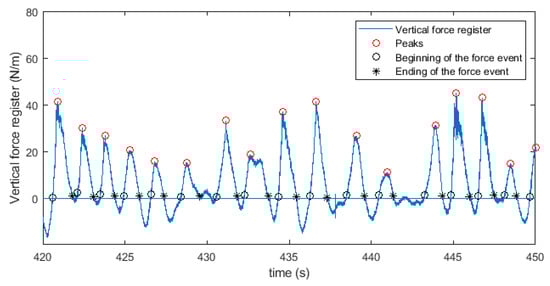 where Kpeak is an experimental coefficient. Kpeak is calibrated for both horizontal and vertical forces in order to maximize the correlation with the Extracted register. Kpeak = 0.1 and Kpeak = 0.35 are obtained for horizontal and vertical forces, respectively; 0.912 ≤ r ≤ 0.924. Figure 10 shows the superposition of the Extracted register (the actual maximum force events) and the triangle-shaped model.