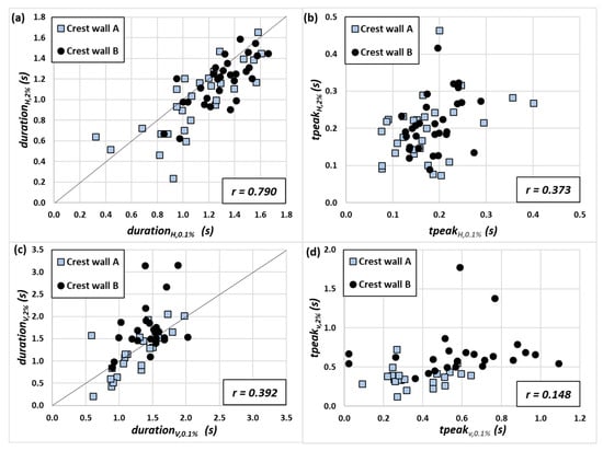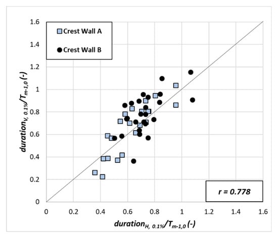 As mentioned in Section 3.2, 59 values (29 for Crest wall A + 30 for Crest wall B) and 47 (22 for Crest wall A + 25 for Crest wall B) of the duration corresponding to the force exceeded by 0.1% of incoming waves (duration0.1%) were obtained for the horizontal (durationH,0.1%) and vertical (durationV,0.1%) forces, respectively. durationH,0.1% and durationV,0.1% corresponding to the same test were compared in order to determine if they present the same behavior. Note that 47 duration0.1% values could be compared (i.e., the minimum number of duration0.1% values, which corresponds to the vertical forces). Figure 11 compares durationH,0.1% and durationV,0.1% corresponding to the same test.