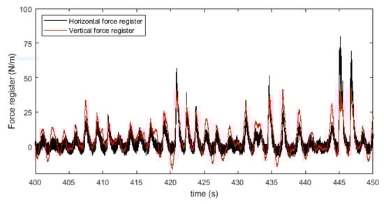 Similar to Section 4.1, the correlation between the Extracted register and a new triangle-shaped register was assessed. Here, the triangle-shaped register was created using the estimated FH,0.1%, FV,0.1%, and duration0.1% using the method in [] (Equations (1) to (4)) and Equation (7). tpeak0.1% in Equation (6) was again calibrated by maximizing the correlation; Kpeak = 0.15 and Kpeak = 0.35 were obtained for horizontal and vertical forces, respectively; 0.874 ≤ r ≤ 0.879. Figure 13 shows the superposition of the Extracted register (the actual maximum force events) and the triangle-shaped model generated with the estimated FH,0.1%, FV,0.1%, and duration0.1%. Note that if (Ru2% − AC) ≤ 0 or (Ru2% − 0.75AC) ≤ 0, FH,0.1% or FV,0.1% result in 0, respectively.