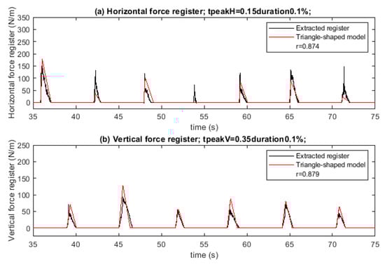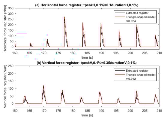 Comparison of Extracted register (the actual maximum force events) and the triangle-shaped model using the measured FH,0.1%, FV,0.1%, and duration0.1% for: (a) horizontal forces, and (b) vertical forces.