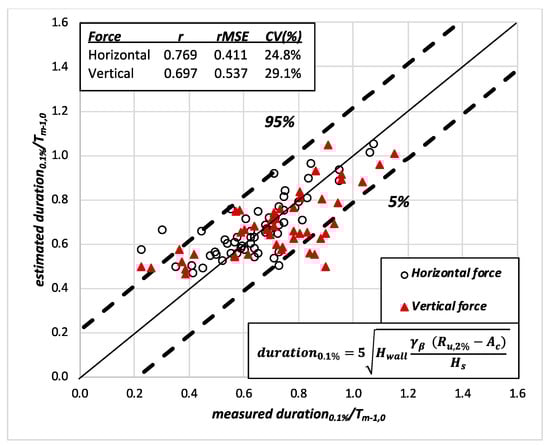 Figure 12 compares the measured and estimated dimensionless duration (duration0.1%/Tm−1,0) using Equation (7), as well as the 90% confidence interval. Here, r = 0.726 and rMSE = 0.472.