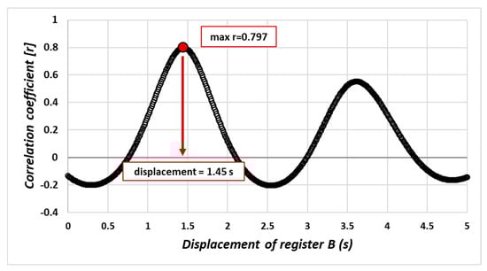 Example of applying the maximum correlation travel time to displace the register at measurement point B (Test #5).