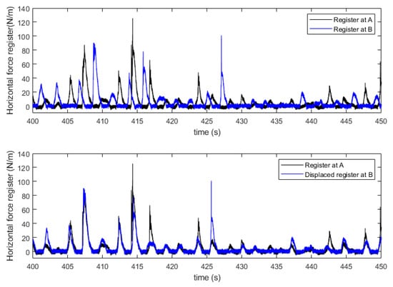In order to extract the travel time from the experimental registers, the register measured at point B (see Figure 1) was moved forward in steps of 0.01 s from 0 s (no displacement) to 5 s. For each step, the correlation between Register A and the displaced Register B was calculated. The travel time corresponded to the displacement time, which maximizes the correlation. This procedure could not be applied to three out of the 30 analyzed vertical force registers, since they were too low. Thus, 57 travel time values (30 values for horizontal forces and 27 for vertical forces) were obtained. Figure 14 shows an example of the exposed procedure for the horizontal force registers in Test #5, whereas Figure 15 presents a comparison between Register A and the original and displaced Register B until the travel time, which maximizes the correlation for Test #5.
