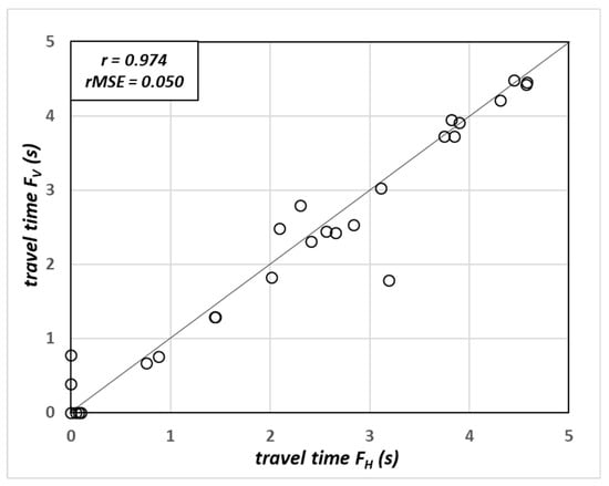 As shown in Figure 16, a very good agreement between the travel time of both horizontal and vertical force events corresponding to the same test was found (r = 0.974; rMSE = 0.050). Therefore, it is reasonable to analyze the travel time for horizontal and vertical forces together.