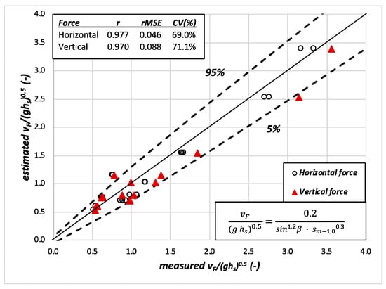 Equation (10) is valid for 15° ≤ β ≤ 75° and 0.018 ≤ sm−1,0 ≤ 0.048. Figure 17 presents the comparison between the measured and estimated dimensionless velocity vF/(g hs)0.5 with Equation (10), as well as the 90% confidence interval. Here, 93.4% of the variance was explained by the model.
