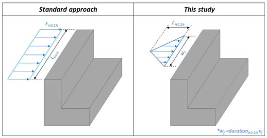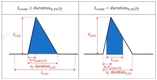 The triangle-shaped force diagram along the longitudinal dimension of the crest wall was obtained for both the horizontal and vertical force events using the method proposed in [] to calculate the maximum loading (Equations (1) to (4)) and Equations (7) and (10) to estimate duration0.1% and vF. The actual force (AF0.1%) that attacks the structure can be calculated using the formula for the triangle area,