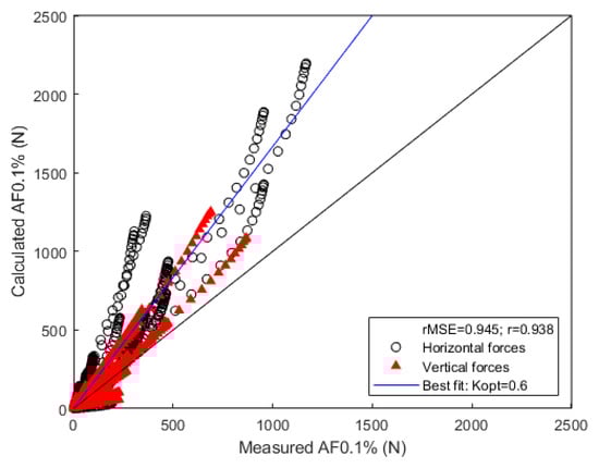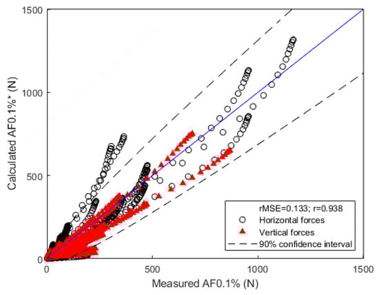 Every alignment of points in Figure 19 represents the AF0.1% variation for one test due to the different values of KA. As shown in Figure 19, the proposed method is on the conservative side. In order to obtain the best fitting approach, AF0.1%* = Kopt AF0.1% is considered where AF0.1%* is the best fit estimated AF0.1% and Kopt is a coefficient to be calibrated. Kopt was calibrated by minimizing the rMSE. The best fit was obtained for Kopt = 0.6 with rMSE = 0.133. Figure 20 presents the comparison between the measured AF0.1% and estimated AF0.1%* using the method in [] (Equations (1)–(4)) and Equations (7) and (10) with Kopt = 0.6, as well as the 90% confidence interval.