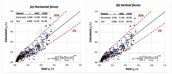 Comparison between the goal γL and the estimated γL with Equation (16), as well as the 90% confidence interval for (a) horizontal forces and (b) vertical forces. Generated cases correspond to open symbols, while test conditions correspond to closed symbols.