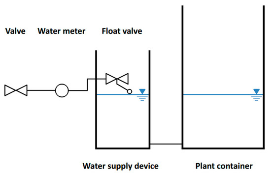 The water supply device consists of a watertight container with a float valve whose position determines the water level both in the water supply device and plant container (Figure 1). The device is permanently connected to a water tap. Water inflow occurs automatically when the water level in the water supply device has dropped enough to activate the opening of the float valve. Water enters the device until the level specified by the float is reached. A water meter installed before the float records the cumulative refill volume.