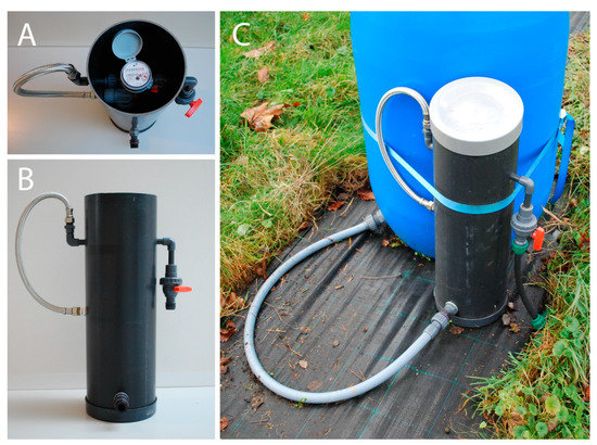 We evaluated whether tree transpiration measured by the device yields comparable results as when measured with a weighing balance. Here we focus on measurement results of two comparable trees of Sorbus aucuparia L. The trees were purchased from Huverba B.V. (Opheusden, The Netherlands). The two trees were positioned next to each other as part of a large field experiment to study plant traits in relationship to transpiration and interception in Nieuwegein, The Netherlands (52° 01′ N, 5° 06′ E, 1 m.a.s.l), in 2017. One tree was placed on a weighing balance (bench scale, series WPT-K, division = 10 g, maximum load = 250 kg, Henk Maas Weegschalen B.V., Veen, The Netherlands), installed in 2017, whereas the other one was connected to a water supply device, installed in 2018. The water supply device was placed directly on the ground next to the plant container (Figure 2C). The water level was set to 19 cm above the bottom of the container. The refill moments of the water supply device were controlled by an electronic valve to ensure that the flow rate through the water meter was sufficient for accurate measurements (see Section 3.1). The number of opening moments of the electronic valve was continuously adjusted to match the water use of the tree, thereby aiming at a refill of at least 1500 mL with each opening. The first refill of the day was at 10:00 CEST at the earliest, the last one at 21:00 CEST at the latest. The valve was opened a maximum of 13 times per day during the summer. The water meter was read once a day before the first refill.