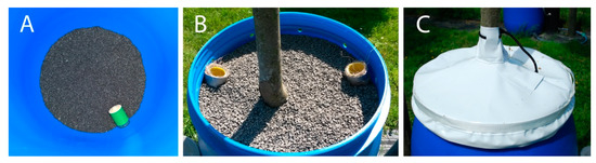 We prepared containers to hold trees of 2–5 m height. As container a barrel made from polyethylene holding a volume of 220 L was used (976 mm high and 590 mm wide at its widest point). The plant container was filled at the bottom with 26 L of basalt gravel (gravel size 2–5 mm) to ensure sufficient flow (Figure 3A). Inside the gravel layer the water supply hose was fitted with a nozzle to minimize the risk of clogging by soil and gravel particles. On top of the gravel layer, 110 L of a dry custom potting soil mixture was added (Lentse Potgrond, Katwijk, The Netherlands; Table 2). Soil compaction and water addition occurred in three additions which filled the container halfway. More soil was added according to the depth of the root system, thereby aiming to create a soil surface level at approximately 10 cm below the rim of the container once planting was completed. A piece of perforated drainage pipe with a diameter of 50 mm placed directly under the roots in an U-shape (thus, one or both ends sticking out of the soil surface, depending on the width of the root system) facilitated air supply to the roots (Figure 3B). Soil evaporation was limited by a 3 cm thick layer of the same basalt gravel as in the bottom of the container, added in 2018 after fertilization (see Section 2.3.1). Soil evaporation measured in containers without a tree indeed proved to be negligible (2.3% of the standardized reference evapotranspiration ETref [17] (see Section 2.4.2), measured over 53 days from May to July 2018). Rain was excluded from the container by means of a cone-shaped rain cape made from watertight sailcloth, installed around the tree stem and rim of the container (Figure 3C). The rain cape contained two covered areas with ventilation holes (opposite each other). To further aid air circulation, around 10 holes of 20 mm diameter were drilled below the rim of the container.