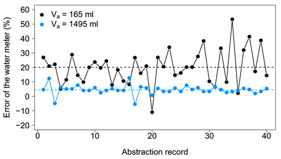 Behavior of the error of the water meter for 165 mL (black circles) and 1495 mL (blue circles) abstraction volumes over the course of 40 abstractions. The dashed line indicates the mean error of the 40 measurements (20.1% for 165 mL, 4.49% for 1495 mL).