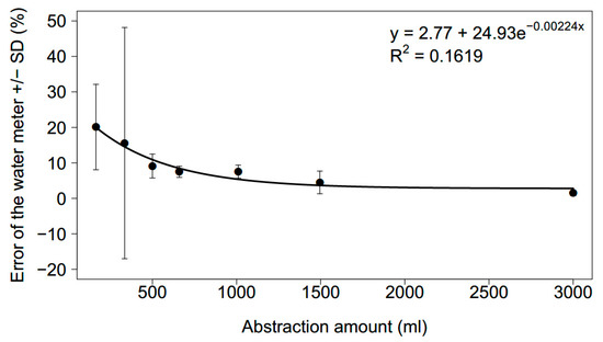 The mean percentage error of the water meter exponentially decreased with an increasing abstraction volume (Figure 5). For low abstraction volumes, the water meter overestimated the refilled volumes on average by up to 20%. The mean error dropped below 5% for a refill volume of approximately 1500 mL and larger (mean = 4.49 ± 3.2% (SD) for 1495 mL); 1500 mL equaled a drop in the water level of 5.4 cm.