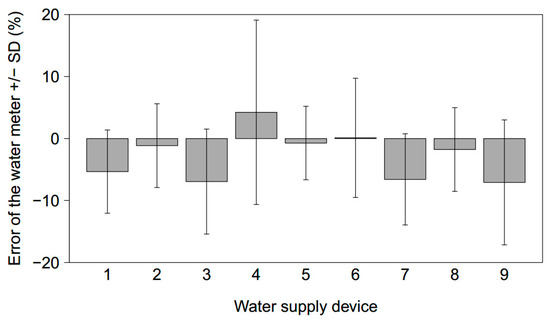 Under field conditions and for an abstraction volume of 1435 mL, both positive and negative mean errors of the water meters were measured when all nine devices were refilled simultaneously (Figure 6). Mean errors ranged from −7.1% to 4.2%; the mean of all devices was −2.8%. Of the tested devices, two displayed positive errors and seven displayed negative errors. The negative errors are in contrast to the errors measured when only one device was refilled at a time (Figure 5).
