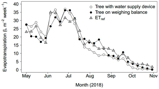 Weekly transpiration of the tree connected to the water supply device (open circles) and the tree on a weighing balance (closed circles). The standardized reference evapotranspiration ETref is plotted for comparison (triangles).