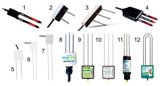 Twelve commercial capacitance sensors from different manufacturers were evaluated under laboratory conditions (Figure 1 and Table 1). The sensors were connected to a datalogger (CR1000X; Campbell Scientific, Logan, UT) to provide power and collect data. The communication between the datalogger and the computer was obtained through a proprietary software (LoggerNet 4.5; Campbell Scientific, Logan, UT).