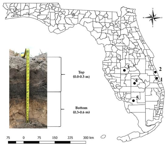 Location of the five sandy soils: Fort Pierce, FL - Pineda soil (1); Vero Beach, FL—Riviera soil (2); Fort Meade, FL—Candler soil (3); Lake Placid, FL - Astatula soil (4); and Immokalee, FL—Immokalee soil (5). Soils were sampled at two different depths (top and bottom layers at 0.0–0.3 and 0.3–0.6 m, respectively).