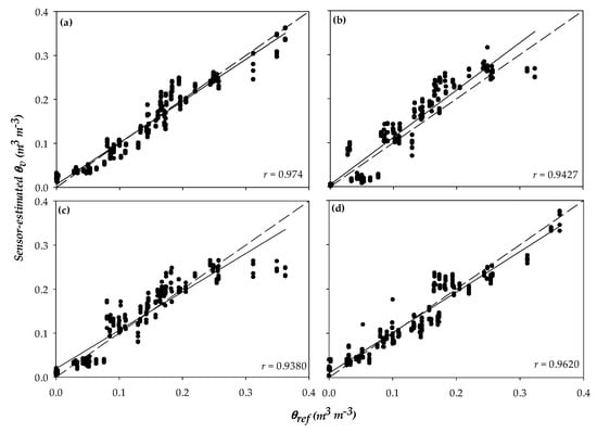 Pearson correlation coefficient (r) between θv measured by sensors using the generic equation provided by the manufacturer and determined by gravimetry (θref) for the Acclima sensors TDR315 (a), TDR310S (b), TDT-ACC-SEN-SDI (c), and TDR315L (d). The solid line is the fitted Pearson’s correlation, and the dashed line is the 1:1 reference. Each point represents a single data value taken from each of the three replications by soil series, soil depths, amount of water added, and evaluated sensors (n = 540).
