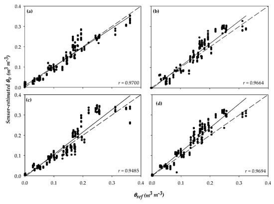 Pearson correlation coefficient (r) between θv measured by sensors using the generic equation provided by the manufacturer and determined by gravimetry (θref) for the Campbell Scientific sensors CS655 (a), CS650 (b), CS616 (c), and Stevens Water’s sensor Hydra Probe (d). The solid line is the fitted Pearson’s correlation, and the dashed line is the 1:1 reference. Each point represents a single data value taken from each of the three replications by soil series, soil depths, amount of water added, and evaluated sensors (n = 540).