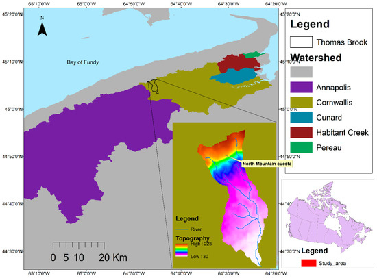 The Thomas Brook catchment is located in the Annapolis Valley of Nova Scotia, Canada (Figure 1) and is one of the major fruit production regions of Canada due to its soil fertility and climatic characteristics [16,17]. The Annapolis Valley is approximately 100 km long and 10–15 km wide and is located along the Bay of Fundy, in between the North Mountain and the South Mountain ranges [18].