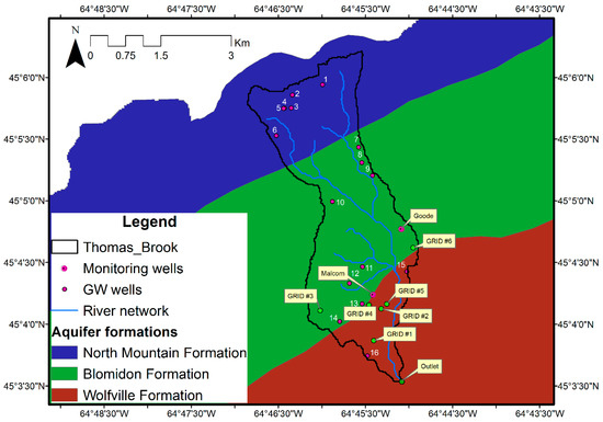 Three types of aquifer formations are found in the Thomas Brook catchment: North Mountain, Blomidon, and Wolfville (Figure 2). The North Mountain formation overlies the Blomidon formation and is composed of a series of tholeiitic basalts characterized by numerous vertical fractures. However, due to the poor connection of the fractures, it represents the poorest aquifer formation of the catchment [19]. The Wolfville formation is composed of medium to coarse-grained sandstone, conglomerate, and siltstone. This formation is the most productive aquifer of the Thomas Brook catchment. The Blomidon formation is the second most productive aquifer in the catchment and has lithological properties that are similar to those of the Wolfville formation, but with more fine-grained layers, especially in the northern part near the North Mountain cuesta. All these formations are tilted with a 5° to 10° dip towards the Bay of Fundy [19].