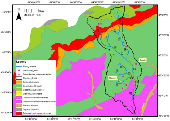 Surficial formations in the Thomas Brook catchment (modified after [17]). The number in rectangle box represents the reach numbers.